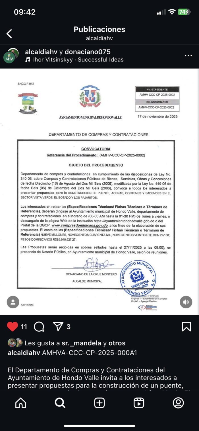 El Departamento de Compras y Contrataciones del Ayuntamiento de Hondo Valle invita a los interesados a presentar propuestas para la construcción de un puente, aceras, contenes y badenes en los sectores Vista Verde, El Botado y Los Pajaritos, conforme a la Ley 340-06 y sus modificaciones.