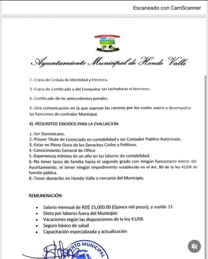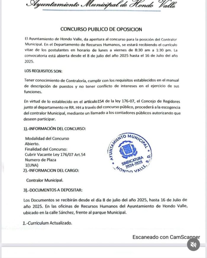 Concurso público abierto. El Ayuntamiento de Hondo Valle abre convocatoria para la vacante de Contralor Municipal.